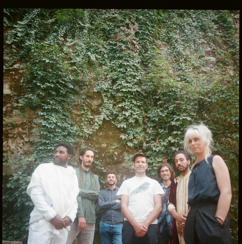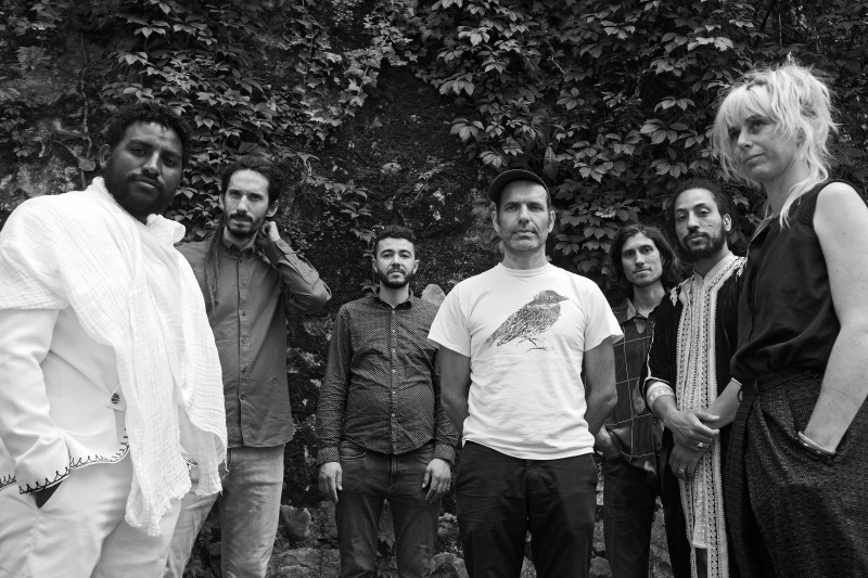 Yalla Miku perfectly encapsulates this ideal and translate it into a borderless, syncretic sound. Yeterian (banjo, electric guitar, voice) and Cyril Cyril bandmate Cyril Bondi (drums and voice) founded the group with the idea of bringing together the different facets of Geneva’s music scene, so they teamed up with post-disco electro pop duo Hyperculte, composed of Simone Aubert of Tout Bleu and Massicot (on synths, guitar, and vocals) and Orchester Tout Puissant Marcel Duchamp founder Vincent Bertholet (on bass and vocals), and invited three immigrant musicians they had gotten to know through their events at the Bongo Joe store and cafè: Moroccan guembri player Anouar Baouna, Eritrean krar player Samuel Ades and Algerian darbouka player Ali Bouchaki.