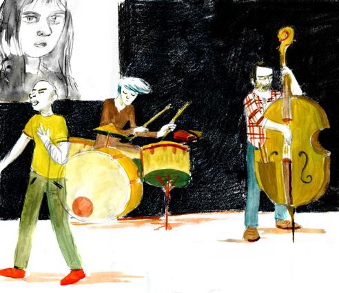 Sur scène, trois personnes, le duo Hyperculte (Vincent Bertholet et Simone Aubert, respectivement à la contrebasse et à la batterie) et l’auteur-metteur en scène Jérôme Richer.